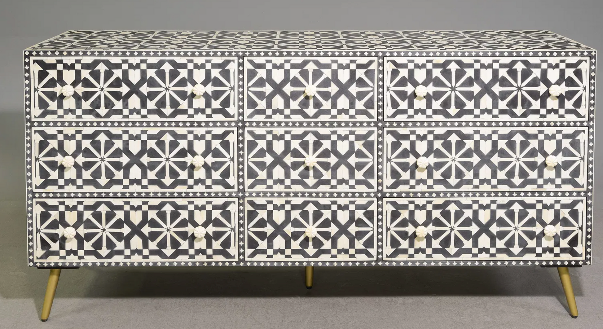 Black & White 9 Drawer Bone Inlaid Chest / Sideboard - 33 in tall x 69 x 18