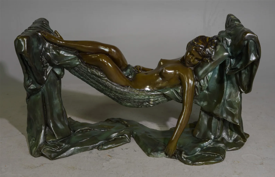 Bronze Art Deco Nude Sculptural Table w/ Glass 84x48x3h
