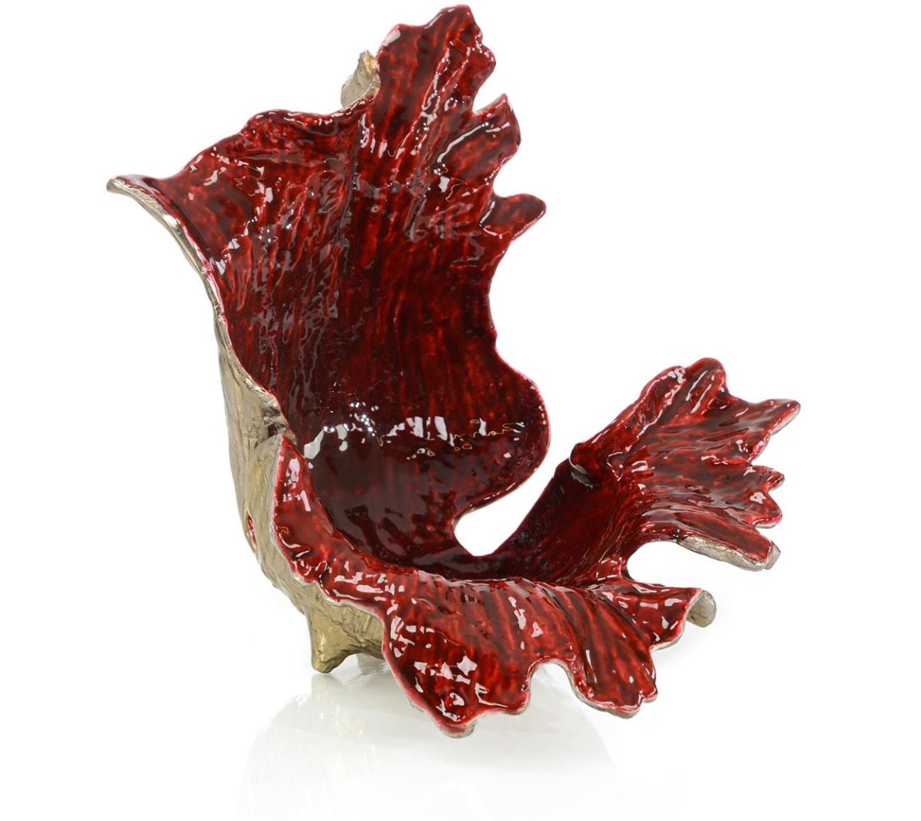 This handcrafted organic shaped bowl with folded edges has been designed with an antique gold exterior and deep crimson red enamel interior.