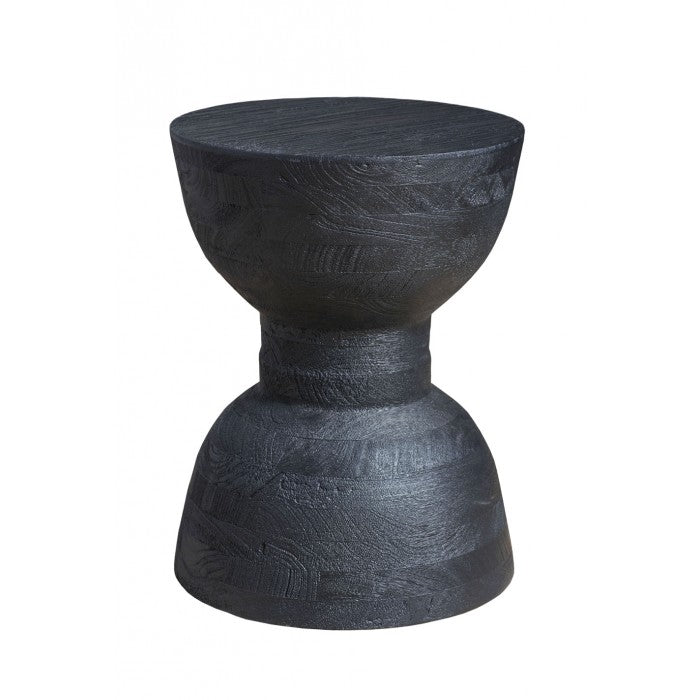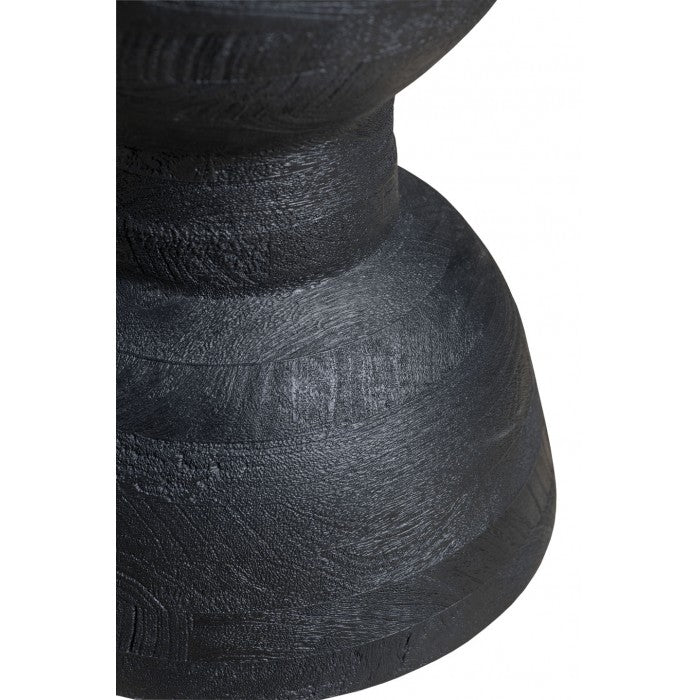 Solid plantation hardwood is turned, hand-hewn, and finished in dark charcoal.