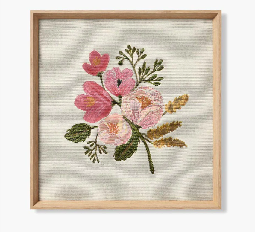 Delicate, rose-toned flowers bloom against a cream background on this woven wall art from Rifle Paper Co. x Loloi. The artwork measures 22” x 21” and is machine-woven in Egypt, then custom-framed in Dallas, Texas.