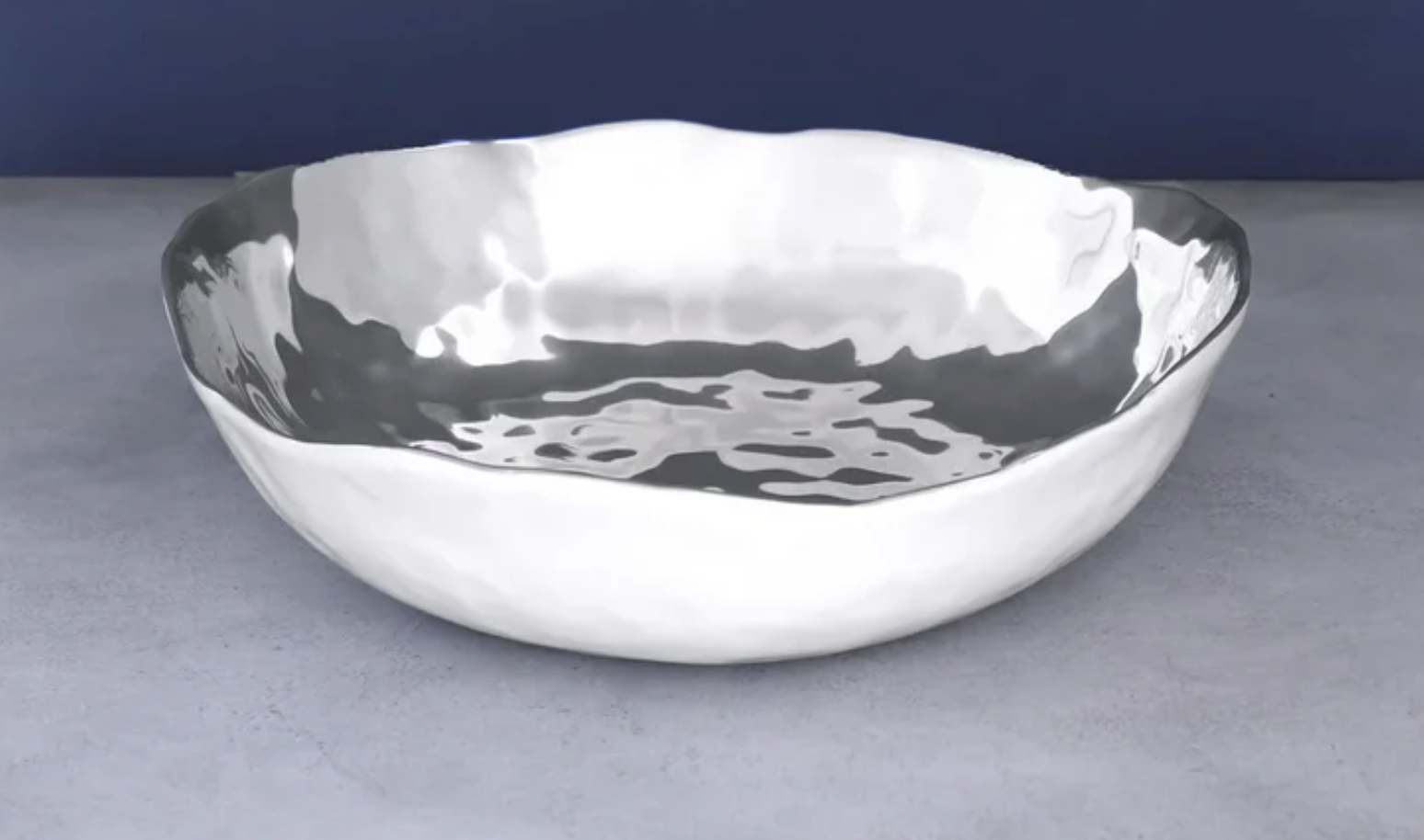 The Thanni Osaka Bowl has a beautiful contrast of white and silver. Elegant and durable, the Thanni Osaka bowl is a great size for salads and makes a striking centerpiece. This is a perfect housewarming gift!